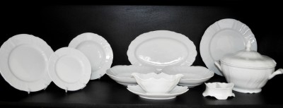 Porcelánová jedálenská súprava Bernadotte biela 26 dielna. Jedálenská súprava Bernadotte obsahuje 6 plytkých tanierov (25cm), 6 hlbokých tanierov (24cm), 6 dezertných tanierov (19cm), ovál, misu guľatú plytkú, 2mísy kompótovej, omáčnik s podstavcom, soľničku a misu polievkovú s pokrievkou. Tradičné reliéfne porcelán.